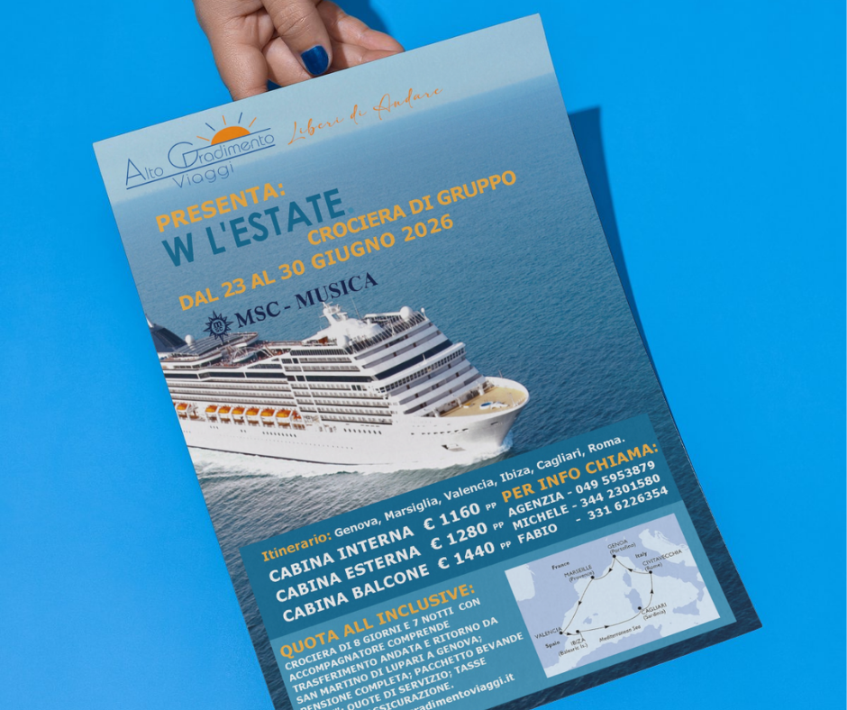 Se stai pensando a una vacanza estiva originale, ti proponiamo Viva l’Estate – Crociera di gruppo a bordo di MSC Crociere: un’esperienza pensata per chi desidera condividere emozioni, panorami e divertimento in compagnia. Un itinerario curato nei dettagli, con partenza in gruppo e assistenza dedicata, perfetto per chi vuole viaggiare senza stress e con la sicurezza di un’organizzazione professionale.